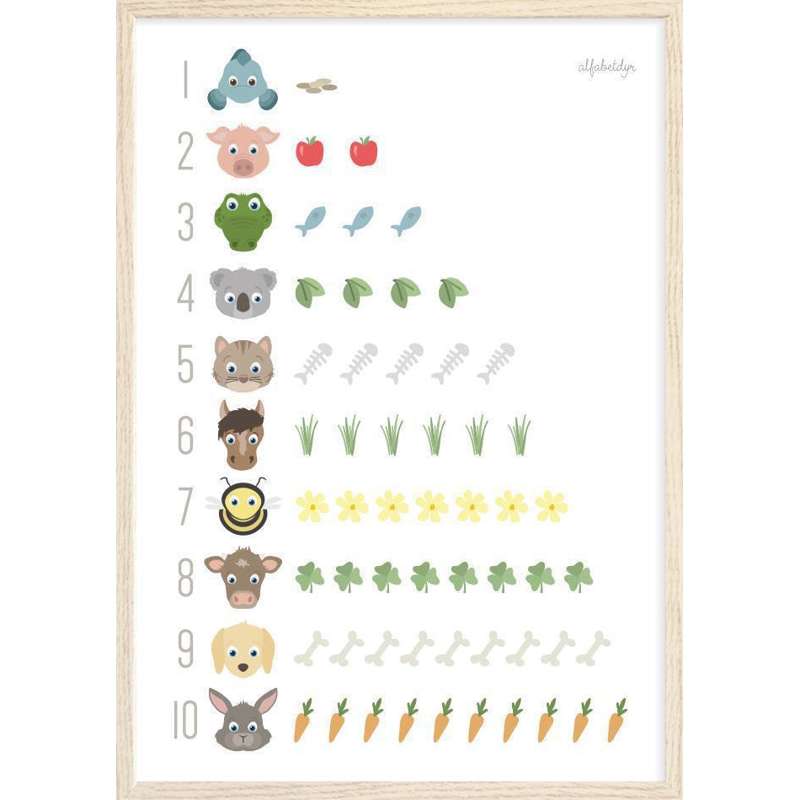 Lär ditt viktigaste minimänniska om siffrorna från 1-10 samtidigt som ni studerar de sötaste små djuren och vad de äter.