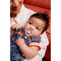 BIBS De Lux erbjuds som den enda modellen i strl. one size. Napphuvudet är runt, tillverkat av silikon och rekommenderas för barn i alla åldrar.