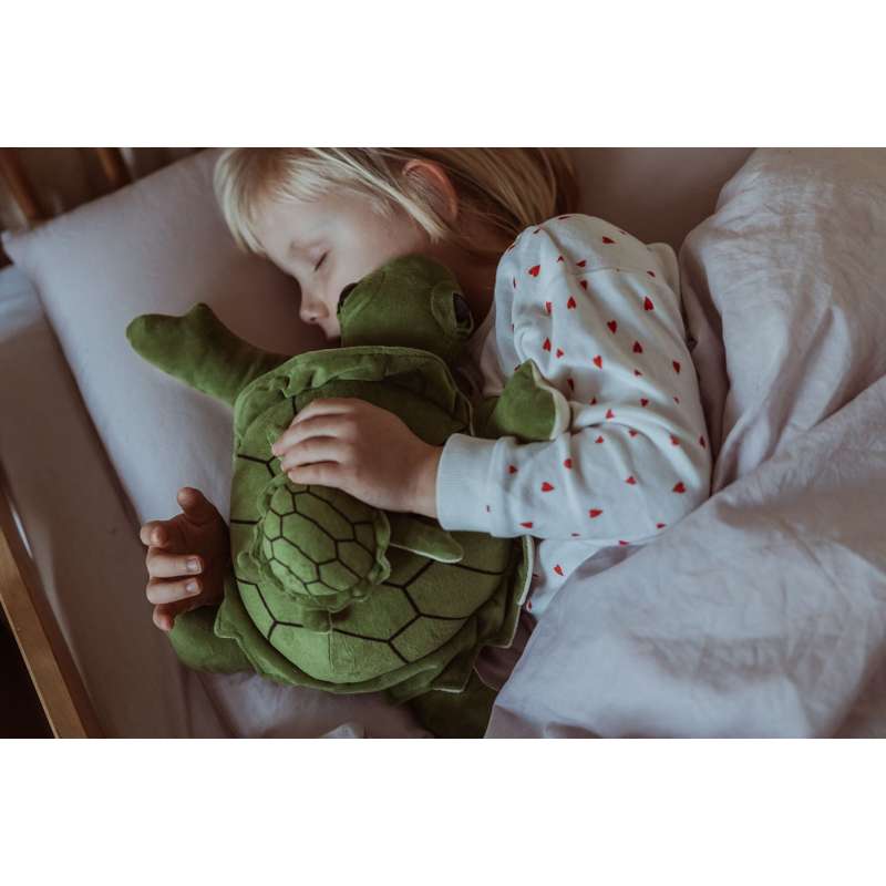 Varenummer: AM-84687Med en charmig sköldpaddsunge vilande på sitt skal, utstrålar denna tyngdsköldpadda en varm och inbjudande personlighet. Den är redo att ta hand om sin lilla unge - och varje barn som behöver en lugnande och lojal vän som kan erbjuda komfort och stöd. Tillverkad av ultramjuk Grön och off-white tyg och med glänsande svarta ögon, är denna 1,6 kg tunga sköldpaddabjörn både mysig och lugnande. Oavsett om den kramas på soffan, krullas ihop under sagostunden eller somnar vid sänggåendet, är detta tyngddjur designat för att skapa en lugn och fredlig atmosfär, vart den än går. Att välja rätt tyngddjur är nyckeln till att säkerställa både säkerhet och komfort. Som riktlinje bör et tyngddjur inte väga mer än 10% av barnets kroppsvikt. Denna genomtänkta design säkerställer att sköldpaddan är lätt att hålla, krama eller bära, och ger en avslappnande och stressfri upplevelse för de små.