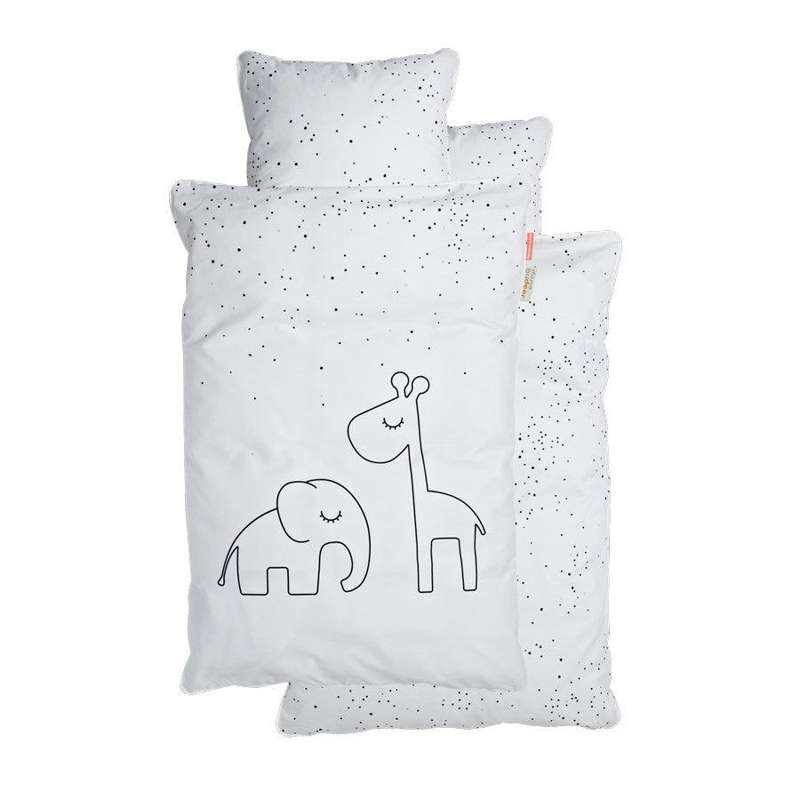Detta läckra sängkläder för baby med Elphee och Raffi på ena sidan och med prickar på den andra sidan.