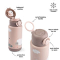 Varenummer: DBD-1051711• Lätt att öppna för små händer med en tryckknapp • Silikonförsegling gör flaskan lufttät och droppfri • Håller vätska varm eller kall i upp till 6 timmar med en gradvis förändring i temperaturen över tid • Et praktiskt bärhandtag gör den lätt att ta med på språng • Flaskan kan innehålla 340 ml • Perfekt för förskola, skola och utomhusäventyr • Söt puderfärg med et fint motiv av Pigee & Sheepy