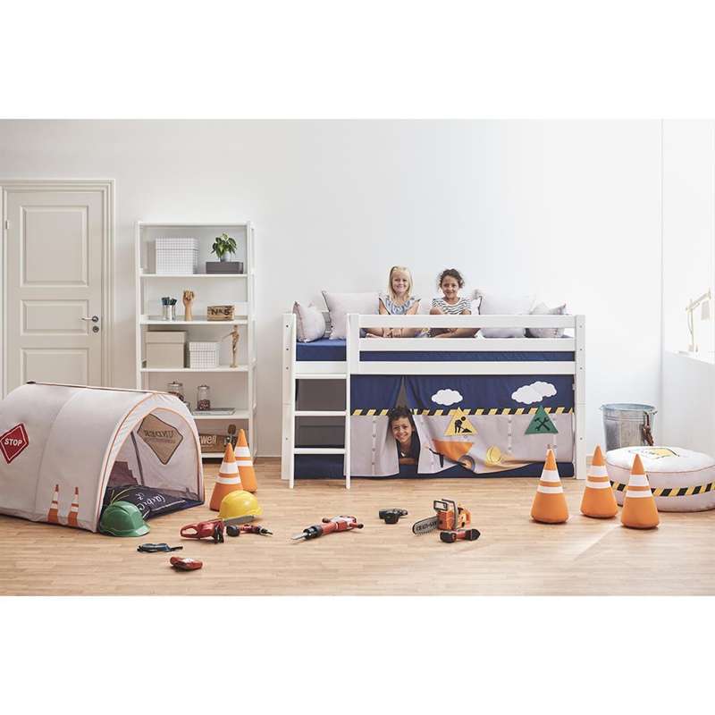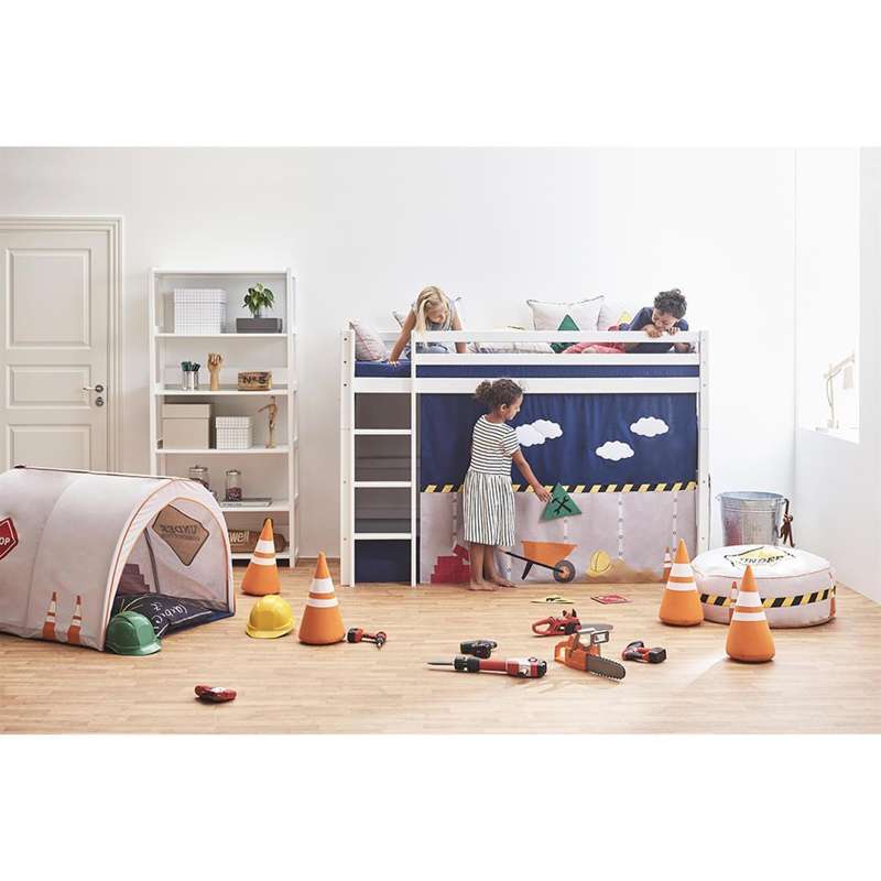 Förutom att förvandla sängen från en "tråkig sovplats" till en rolig byggplats, så skapar gardinet också en mysig koja under sängen. Tillsätt en madrass, några kuddar och en ljusslinga för att få den optimala koja-stämningen.