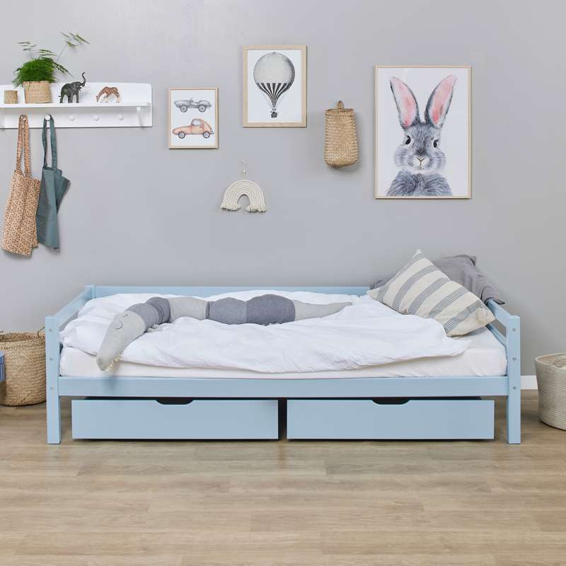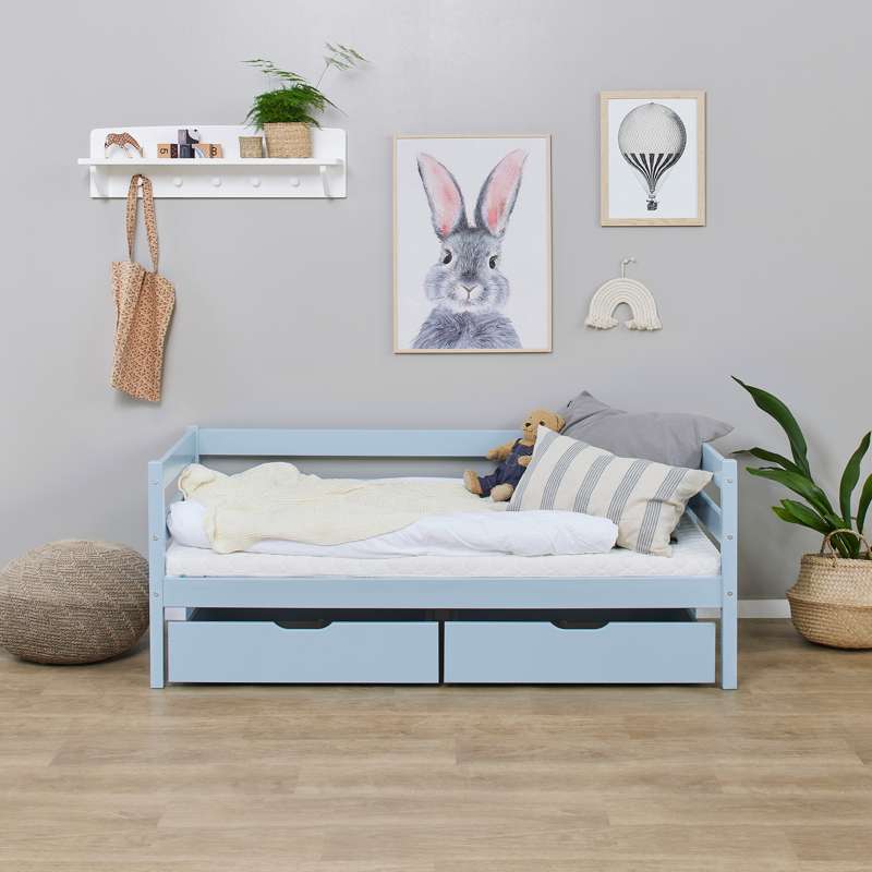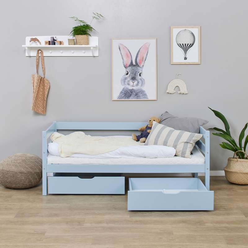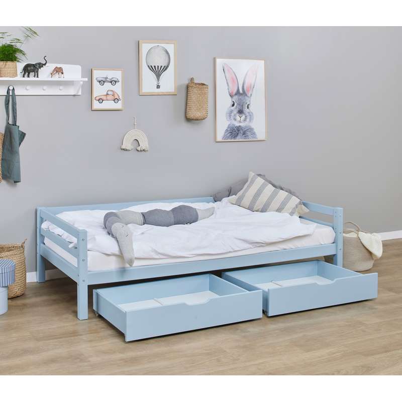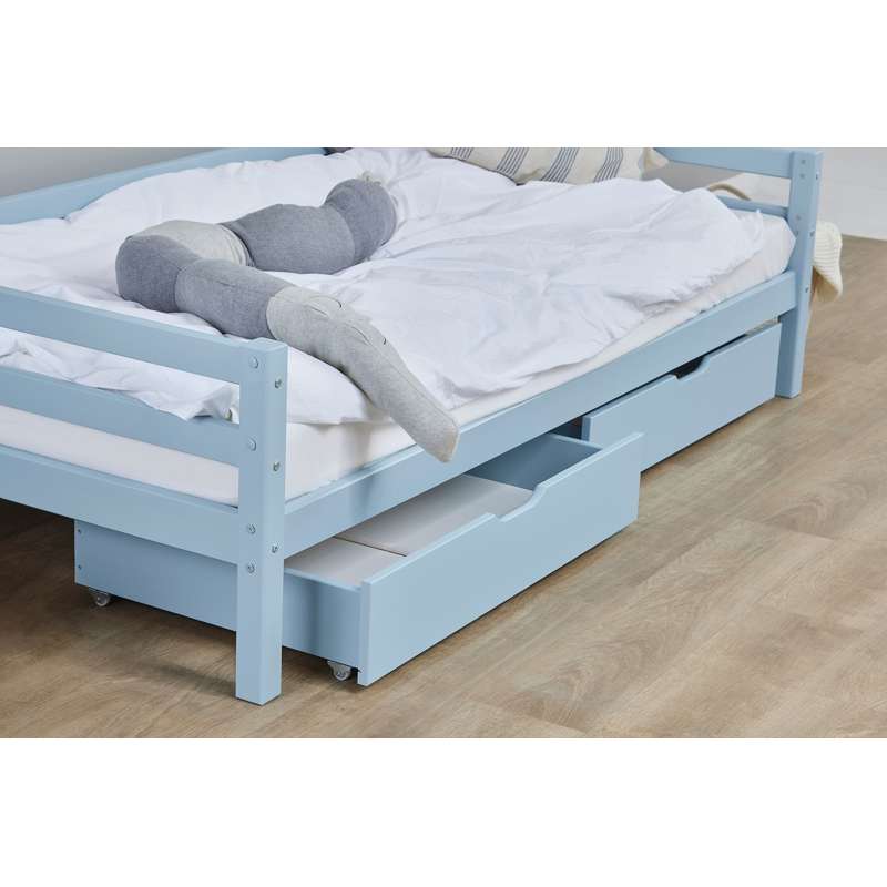 Utnytta platsen under sängen för förvaring med et smarta lådsystemet från Hoppekiks. Lådsystemet består av 2 stora breda lådor med hjul, så de enkelt kan rullas fram och tillbaka under sängen. Lådorna är rymliga, så det finns gott om plats för förvaring av leksaker, sängkläder eller kanske något helt annat. Setet kommer i en vacker blå färg, men finns i flera fina färger som passar till sängarna från Hoppekids.