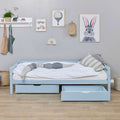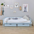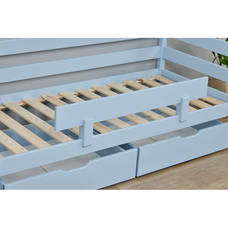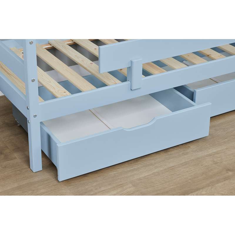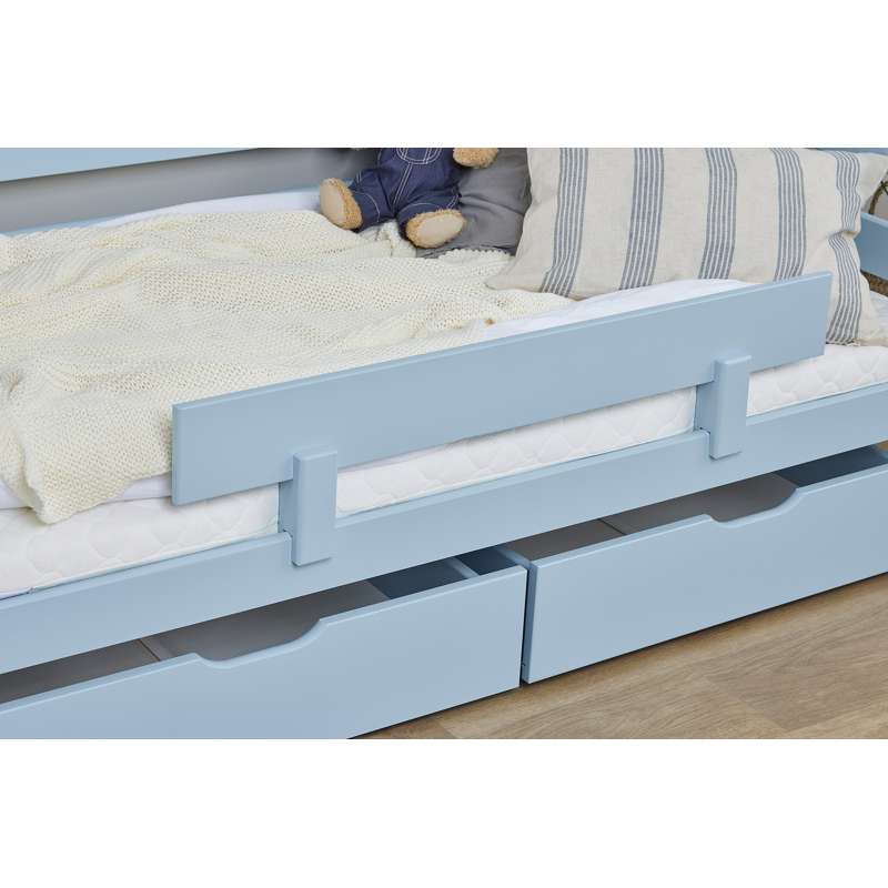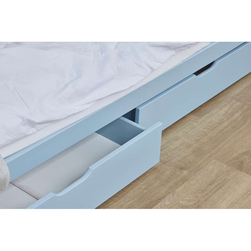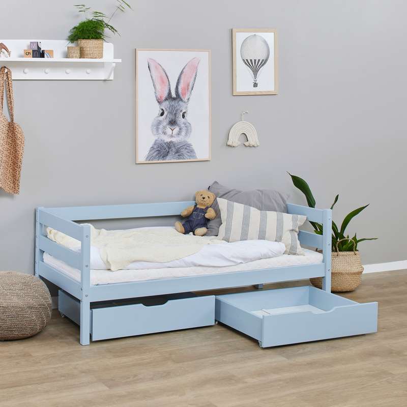Utnytta platsen under sängen för förvaring med et smarta lådsystemet från Hoppekiks. Lådsystemet består av 2 stora breda lådor med hjul, så de enkelt kan rullas fram och tillbaka under sängen. Lådorna är rymliga, så det finns gott om plats för förvaring av leksaker, sängkläder eller kanske något helt annat. Setet kommer i en vacker blå färg, men finns i flera fina färger som passar till sängarna från Hoppekids.