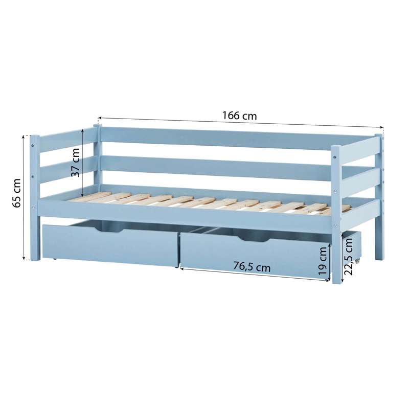 Mått på lådsystemet för säng med liggmått 70 x 160 cm: 153 x 19 x 60 cm.