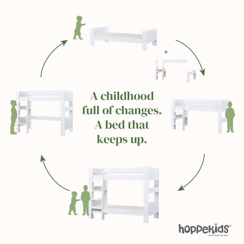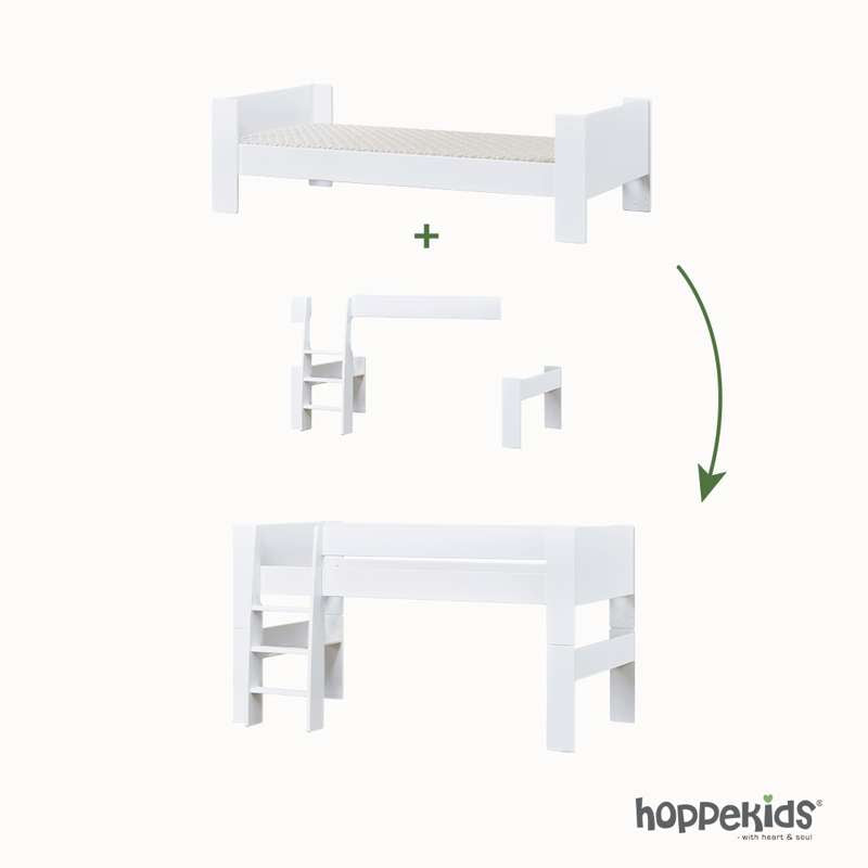 Hoppekids PURE Halvhög loftsäng är en del av et sängsystem, vilket betyder, att sängen kan byggas om till en annan sängtyp. Den halvhöga sängen består av en Juniorsäng och et modul. Du kan därför ta bort modulen och använda sängen som en Juniorsäng istället. Vid tillköp av moduler, kan sängen också byggas om till en Loftsäng (med modul artikelnummer: 31-6180-82-09A) och en Våningsäng (med modul artikelnummer: 31-6151-82-09A).