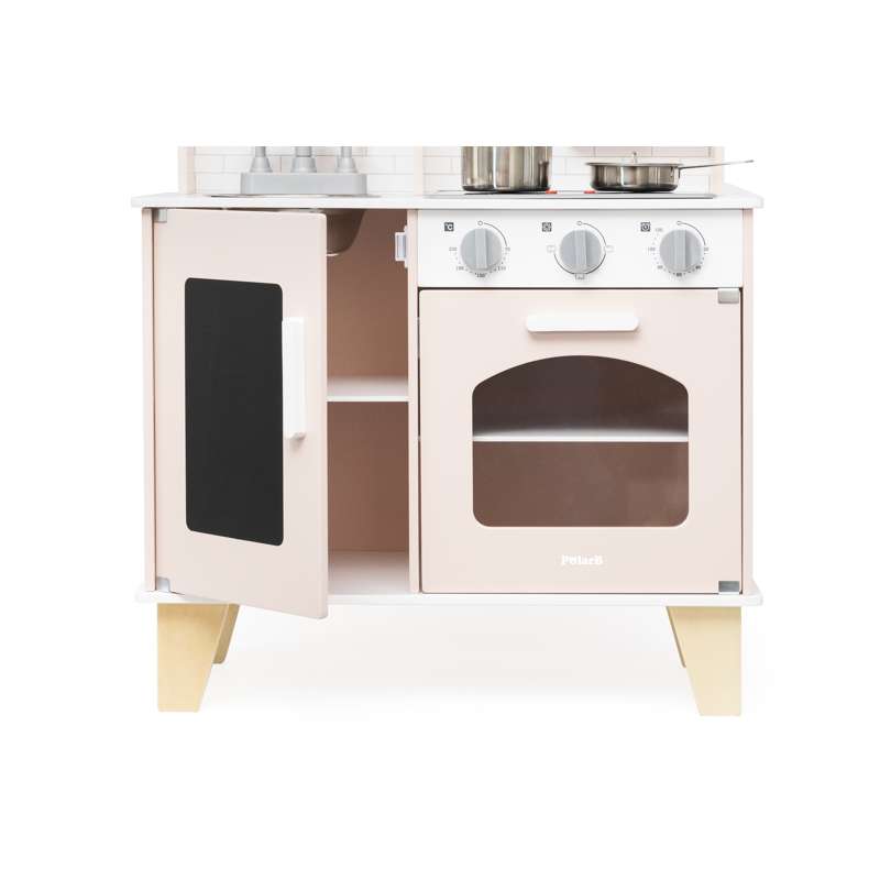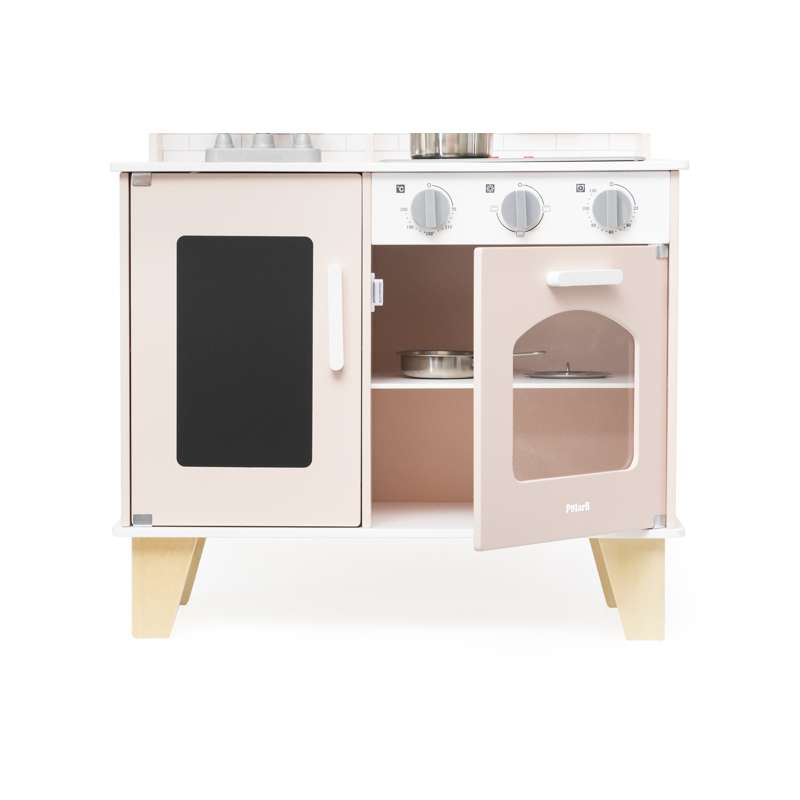 Lekköket är tillverkat i robust trä och passar in i både barnrummet och vardagsrummet med sin stilrena design. Det är i en praktisk höjd, så barnet lätt kan nå alla element och leka självständigt – vilket stärker finmotoriken, fantasi, språk och sociala färdigheter.