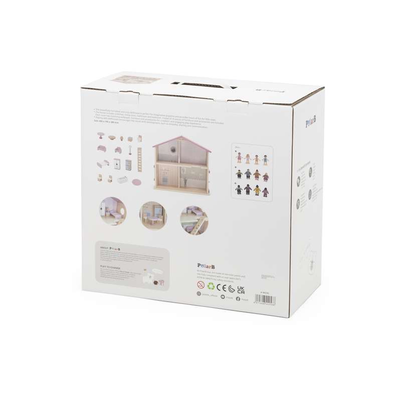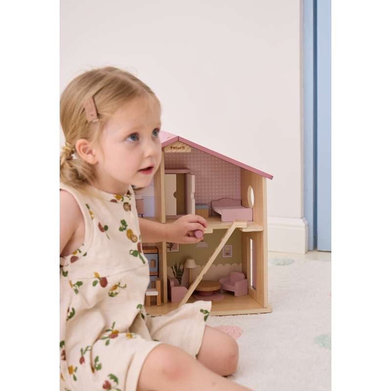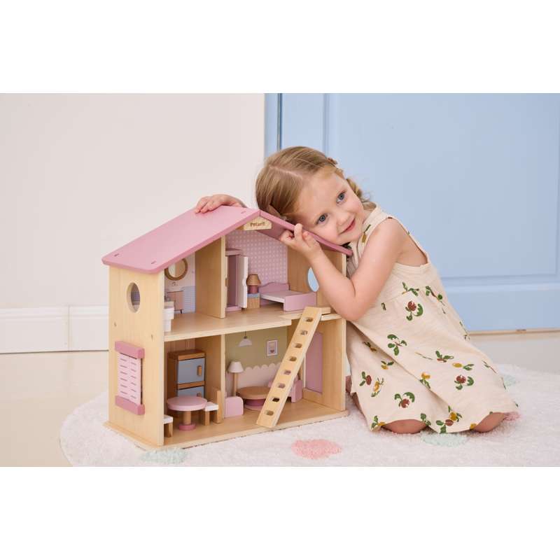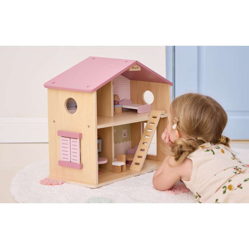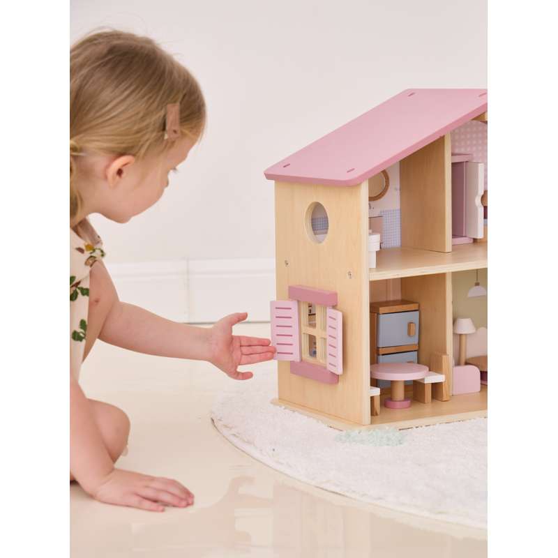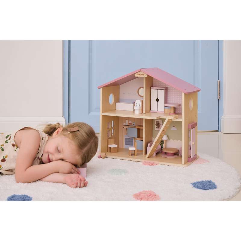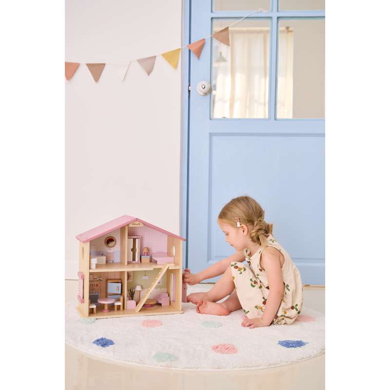 Dukkehuset er ideelt til både selvstændig og fælles leg – og passer flot ind på børneværelset med sit charmerende udtryk og gennemtænkte indretning.