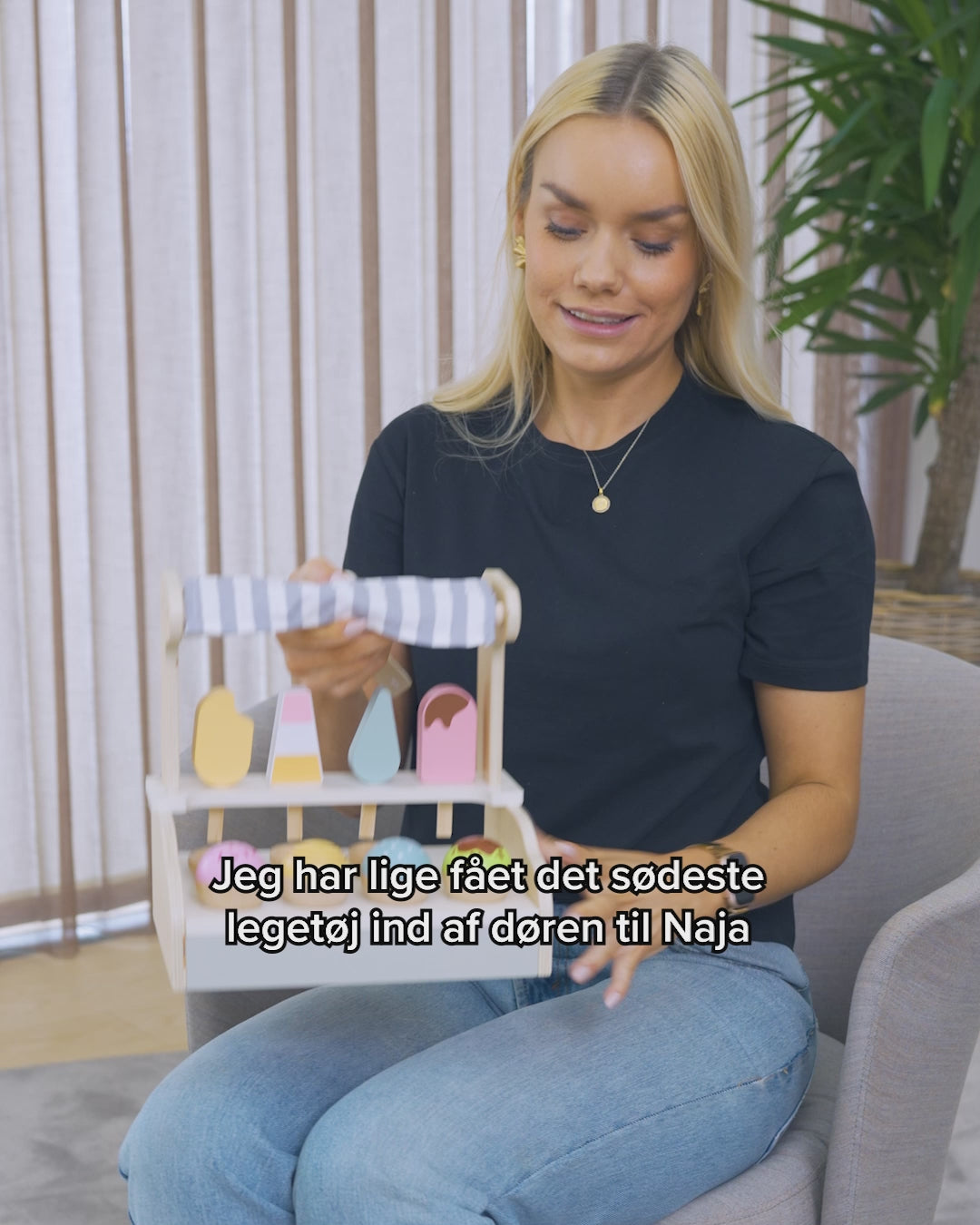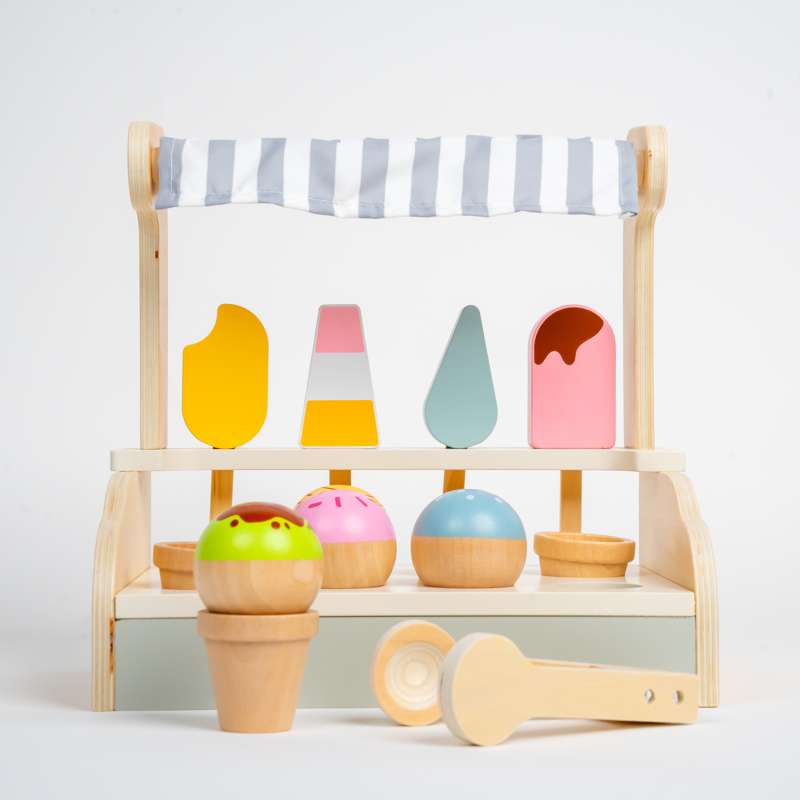 Fin glassbutik i trä från danska Kid'oh. Glassbutiken innehåller massor av glass, våfflor, kulor och skedar för att ta med sig glassen.