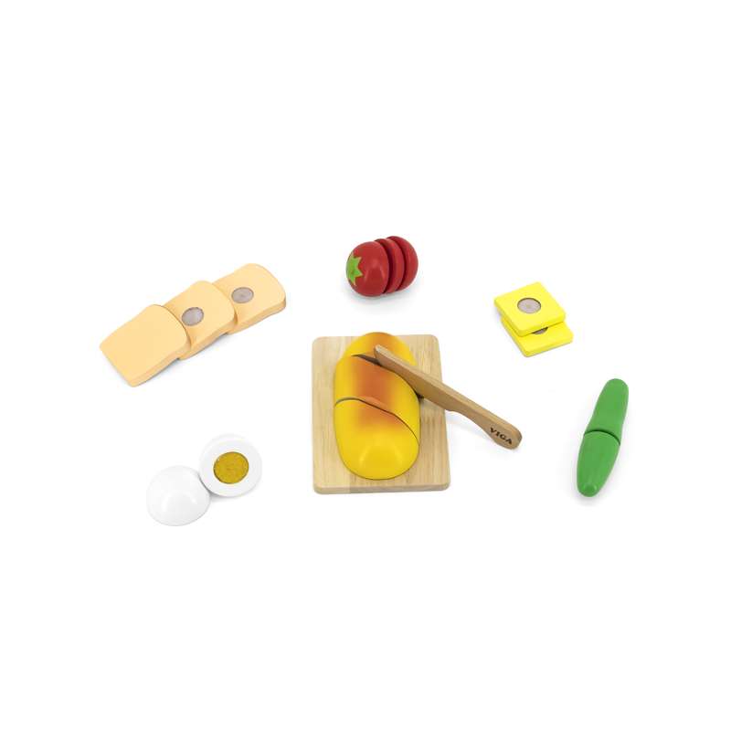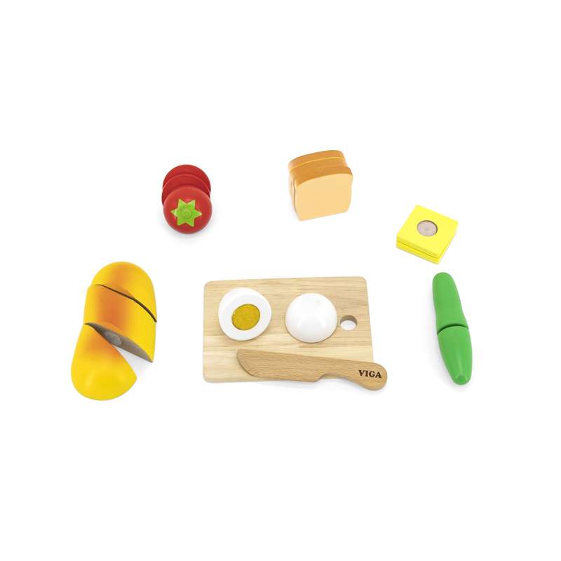 De forskellige madvarer – herunder brød, æg, agurk, toast, tomat og smørskiver – er designet med velcro, så de kan skæres i stykker og samles igen. Det gør legen realistisk og giver barnet mulighed for at eksperimentere med madlavning og sammensætning.