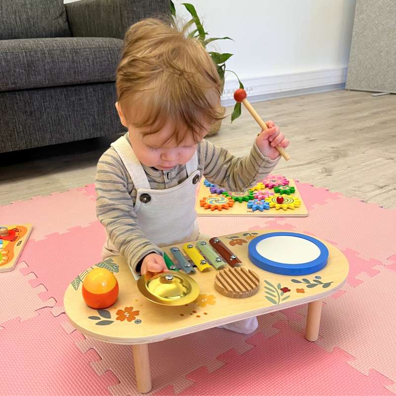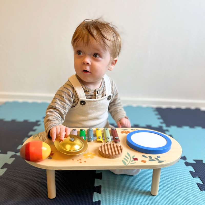 Detta musikaliska bord innehåller 1 trumma, 1 xylofon, 1 cymbal, 1 xylofon, 1 rasselägg och 2 trumstickor. Barn älskar att spela och dansa till rytmen av sitt trumset. * Förbättrar finmotorik och hand-öga-koordinering. Stimulerar sinnen och kreativitet. Barn kommer att älska att utforska ljud.