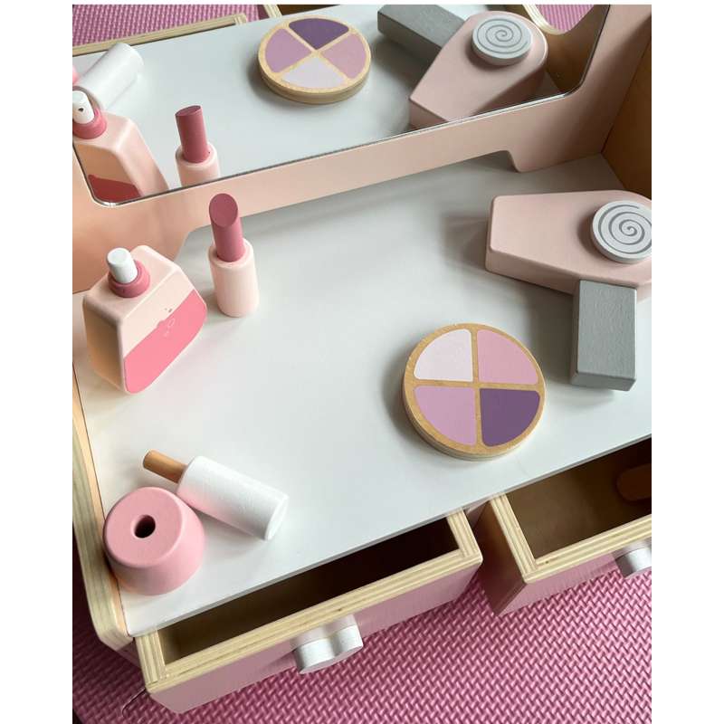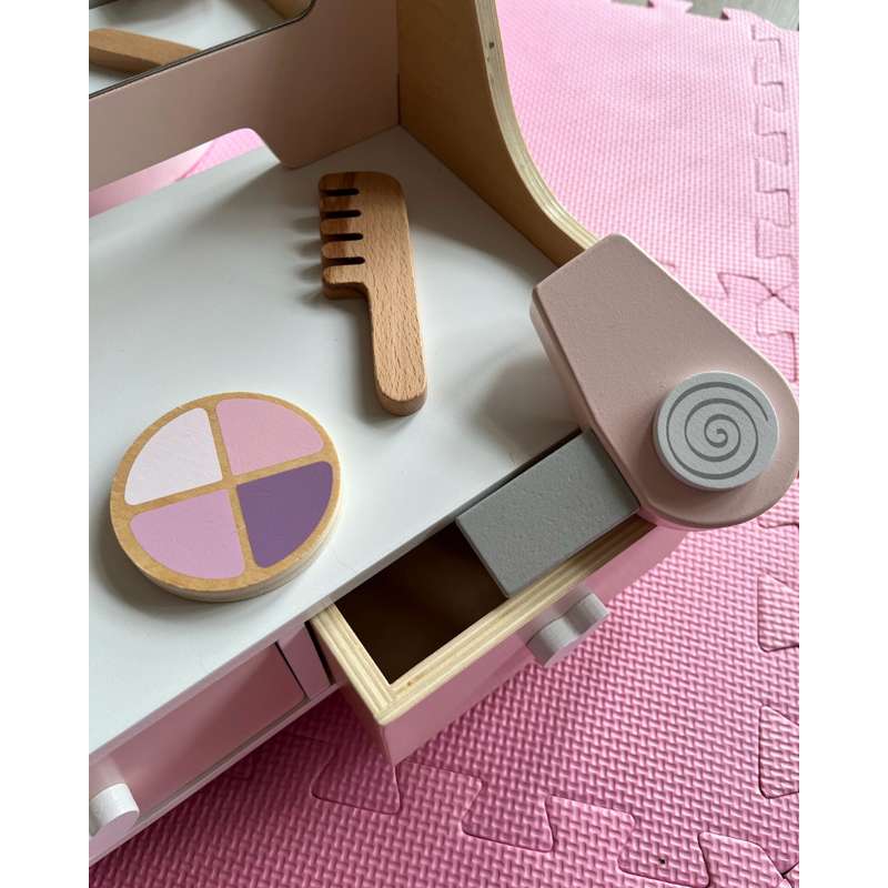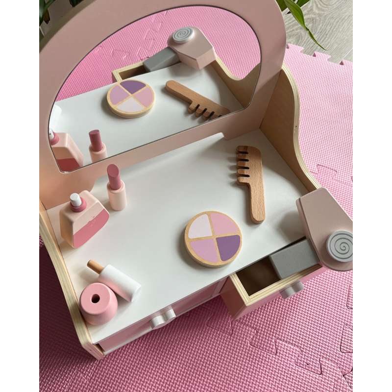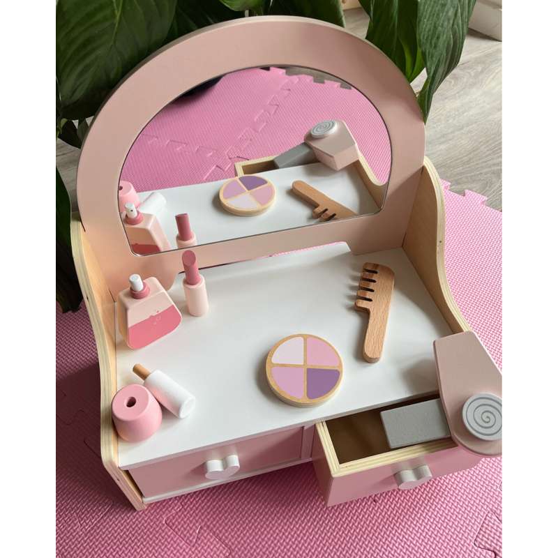 Fin liten sminkebord/frisörbord med tillbehör. Bordet har 2 lådor, 1 spegel, hårtork, nagellack, läppstift, puder, parfym och kam. Allt är gjort i trä.