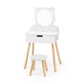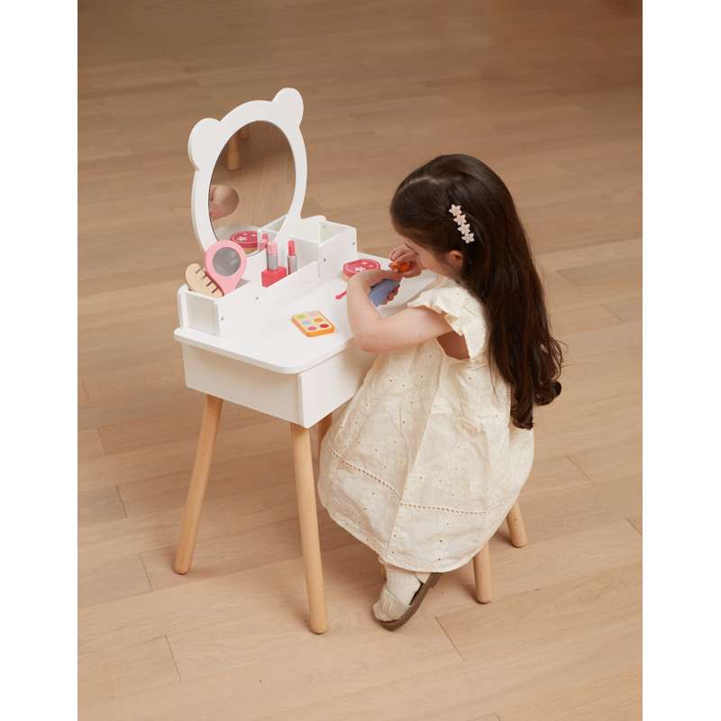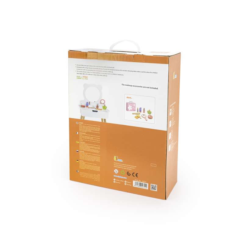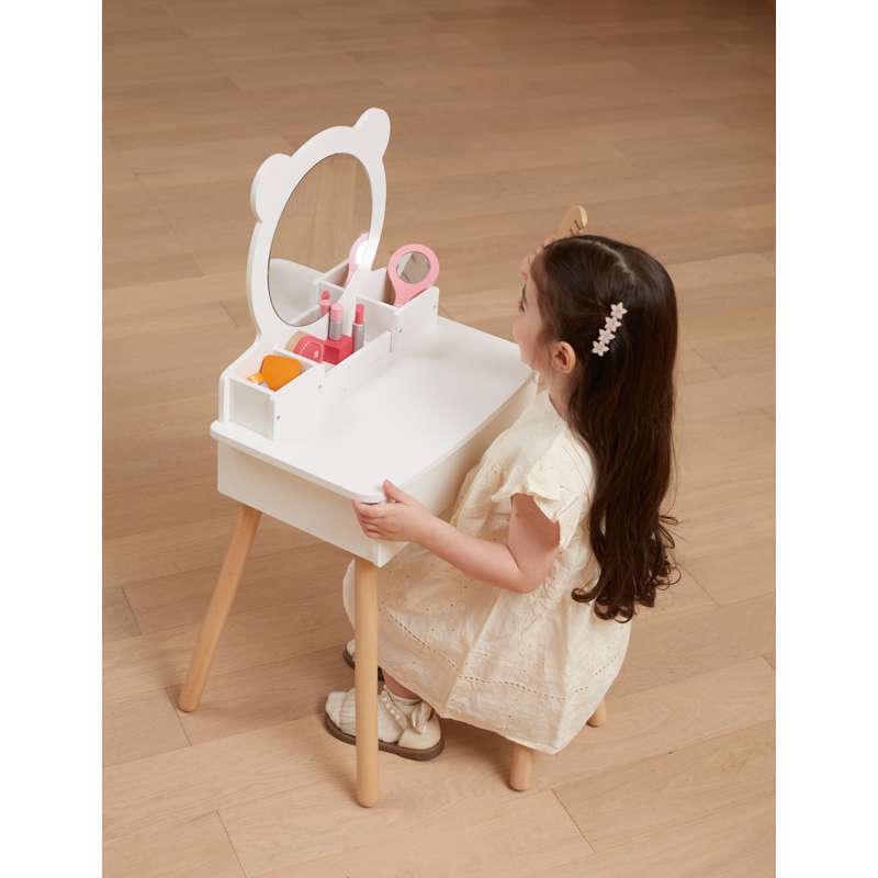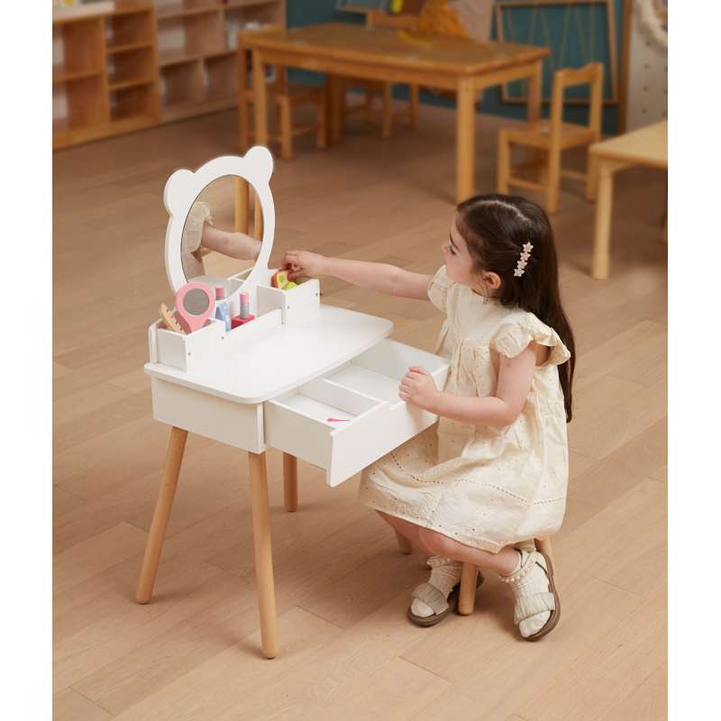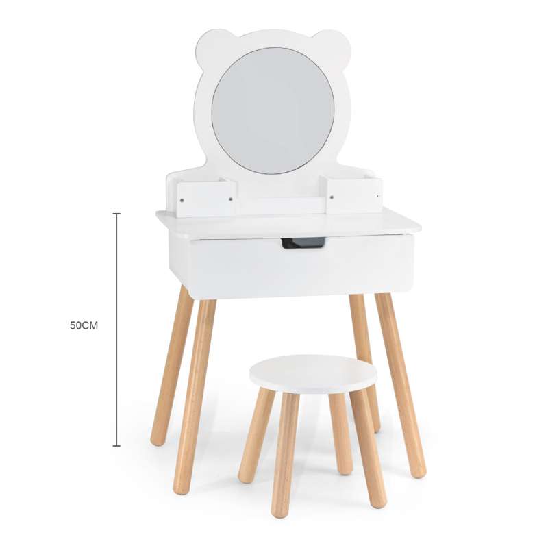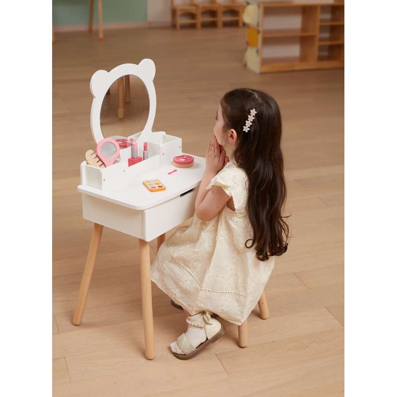 Låt ditt barn göra sig i ordning vid detta charmiga sminkbord med tillhörande pall – perfekt för små prinsessor och stylister under utveckling! Det solida träbordet är utrustat med en stor och rymlig låda som ger massor av förvaringsutrymme för leksaker, smycken, håraccessoarer och barnmakeup. Här kan barnet utforska sin kreativitet och leka sig in i rollen som frisör, stylist eller stjärna framför spegeln. Den eleganta och tidlösa designen gör bordet till ett vackert tillskott i varje barnrum eller lekhörna, där det både pryder och inspirerar till rollspel och självuttryck.