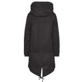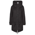 Det finns en dold huva inuti kragen, två snedställda fickor fram, en bröstficka med dragkedja, snöre under magen och i nederkanten, remmar vid ärmsluten och slits bak nere.