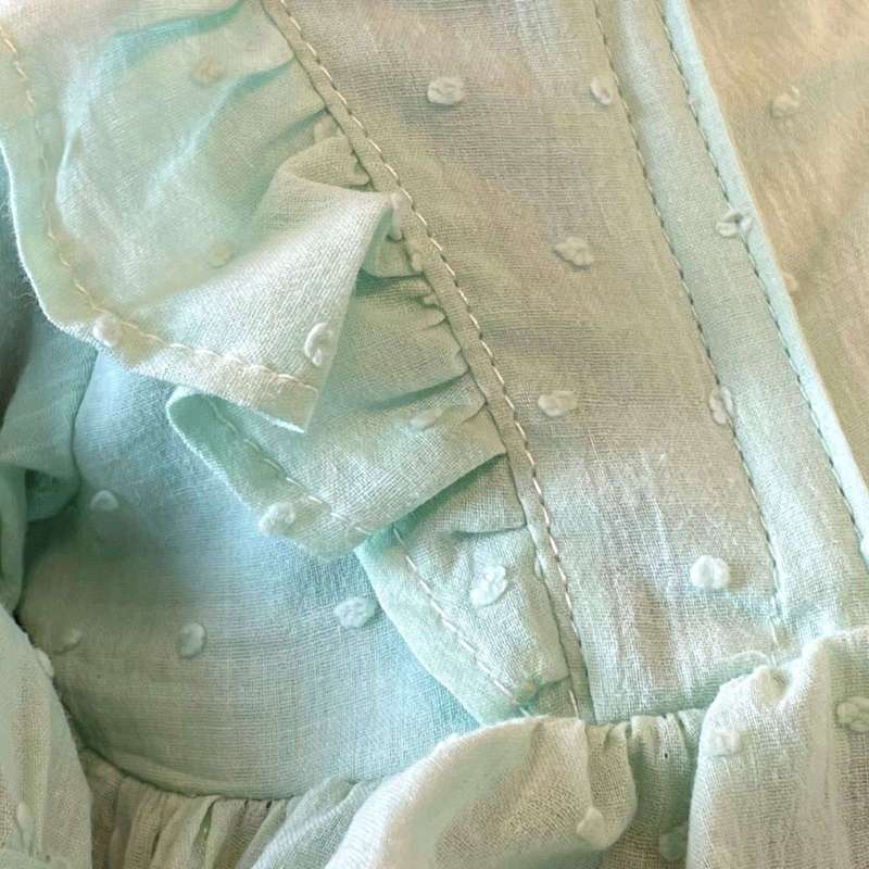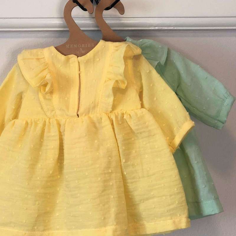 Håndsydd i lätt bomullsmusselin med prickig struktur i vävningen. Klänningen passar alla Leo, Leonora, Maria och Pablo dockor och är en del av mixa och matcha kollektionen från Memories by Así, där barnet eller gåvogivaren själv väljer dockans kläder.