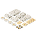 Antal lösa delar: 34 st.: - 7 skumklossar - 18 samlingspinnar - 4 svänghjul - 4 skumhjul - 1 inspirationshäfte