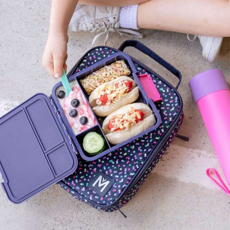 I locket på lunchlådan sitter en silikonförsegling som stängs ner över avskiljarna i lådan. Detta gör att alla rum som är förseglade sluter tätt, och därmed kan du fint servera tjockflytande dressing, ketchup, hummus, pesto m.m. i din MontiiCo. Lägg dock inte vätske-/vattniga livsmedel i rummen.