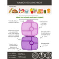 Med Yumbox Go får du en funktionell, lätt och användarvänlig matlåda, som kombinerar stor kapacitet med et kompakt design. Den är skapad för att göra vardagen lättare och matsäcken mer inspirerande – oavsett om den används för skola, kontor, resor eller små måltider på språng.